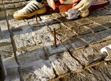 В углу участка делаем лавочку. Брусчатку под её ножками зачищаем, всё выставляем по уровню, для дополнительной надёжности конструкция удерживается е только на клею, но и на штырях. Параллельно делаем верх одного из памятников.